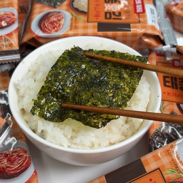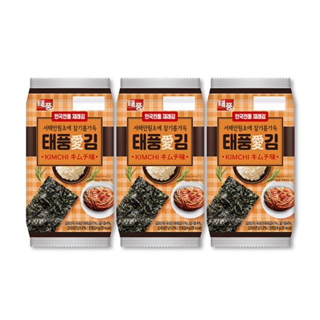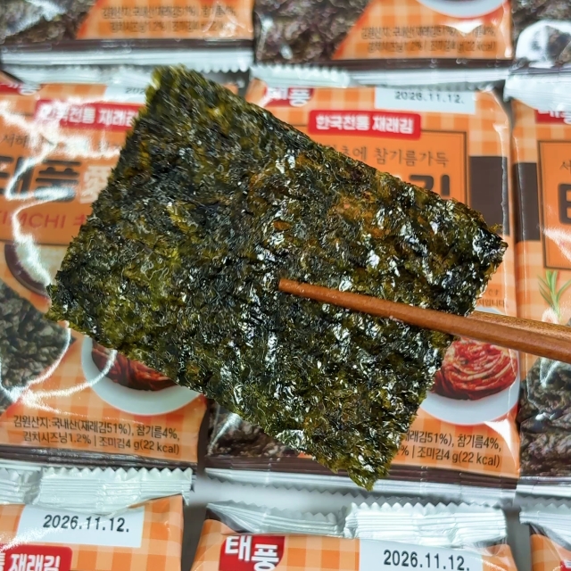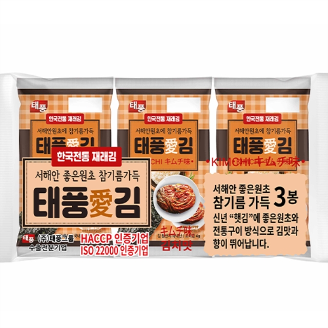 | 1-4. 원재료명 (「농수산물의 원산지 표시 등에 관한 법률」에 따른 원산지 표시 포함) | 재래김(국산)51%, 옥배유(외국산: 미국, 러시아, 브라질 등), 참기름(외국산: 인도, 나이지리아, 이탈리아, 피아 등), 김치시즈닝(국산), 가공소금(국산), 허브추출물(조미김용 혼합추출물, 미국산) |