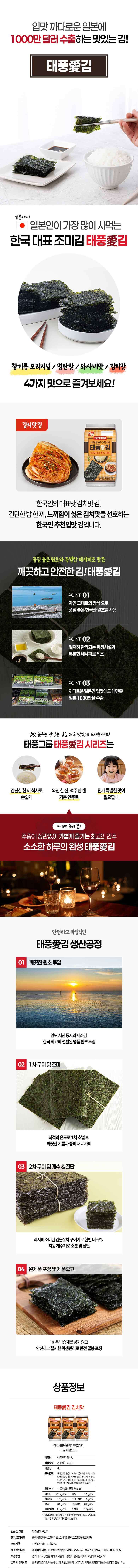 | 1-4. 원재료명 (「농수산물의 원산지 표시 등에 관한 법률」에 따른 원산지 표시 포함) | 재래김(국산)51%, 옥배유(외국산: 미국, 러시아, 브라질 등), 참기름(외국산: 인도, 나이지리아, 이탈리아, 피아 등), 김치시즈닝(국산), 가공소금(국산), 허브추출물(조미김용 혼합추출물, 미국산) |
